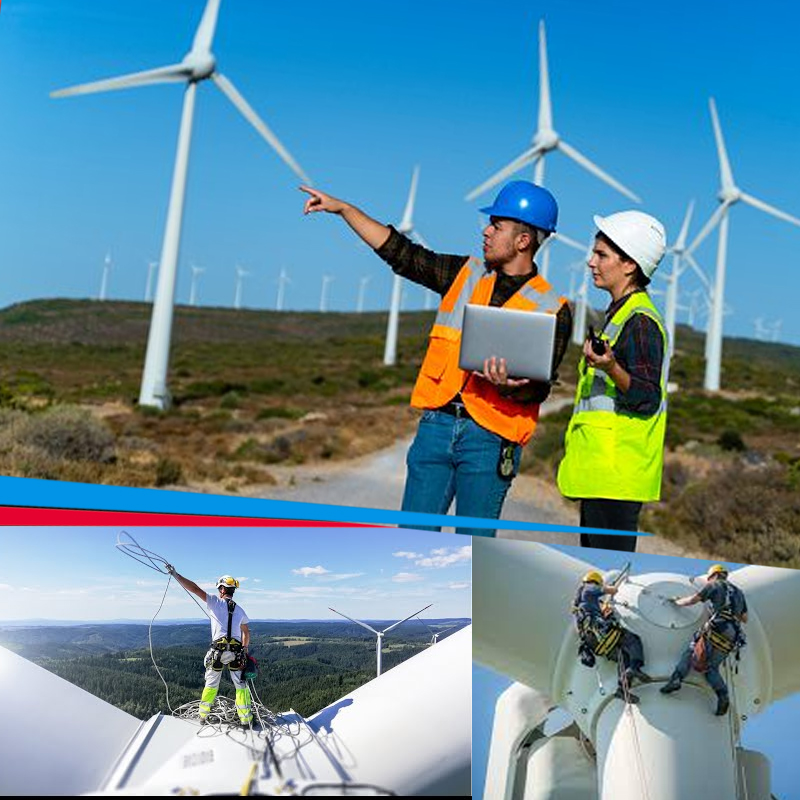 Wind turbine technicians: Install wind turbine towers on land or at sea. Fit electrical, mechanical, and hydraulic equipment. Test turbine blades and control systems. Carry out maintenance, find faults, and perform repairs. Run safety checks on electrical substations and cables. Complete safety reports and record job details.